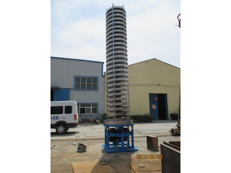 ZC系列垂直提升機的驅動裝置振動電機安裝在輸送塔下部,兩臺振動電機對稱交叉安裝,輸送塔由管體和焊接在管體周圍的螺旋輸送槽組成,輸送塔座于減振裝置 上,減振裝置由底座和隔振彈簧組成。當垂直提升機工作時,根據(jù)雙振動電機自同步原理,由振動電機產生激振力,強迫整個輸送塔體作水平圓運動和向上垂直運動 的空間復合振動,螺旋槽內的物料則受輸送槽的作用,作勻速拋擲圓運動,沿輸送槽體向上運動,從而完成物料的向上(或向下)輸送作業(yè),因此本設備也被成為振 動垂直輸送機。